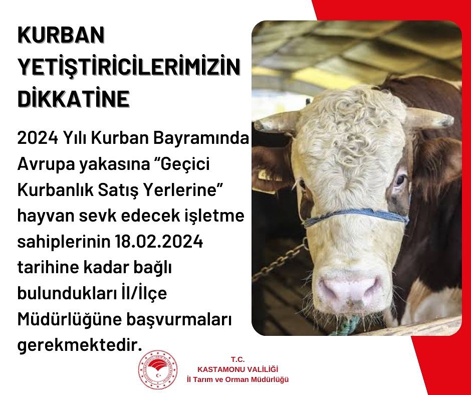 Yapılan hatırlatmada: "Trakya Bölgesine kurbanlık sevk edecek yetiştiricilerimizin 18.02.2024 tarihine kadar İl/İlçe Müdürlüklerine başvurmaları gerekmektedir. Yetiştiricilerimize duyurulur" denildi.