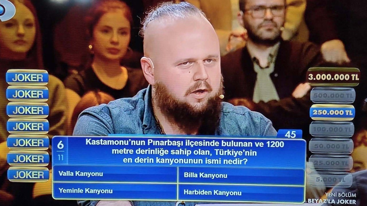 Kanal D’de yayınlanan Beyaz’la Joker yarışmasında; yarışmacıya 500 bin TL değerindeki soruda, Kastamonu’nun Pınarbaşı ilçesinde bulunan ve 1200 metre derinliğe sahip Türkiye’nin en derin kanyonunun adı soruldu.