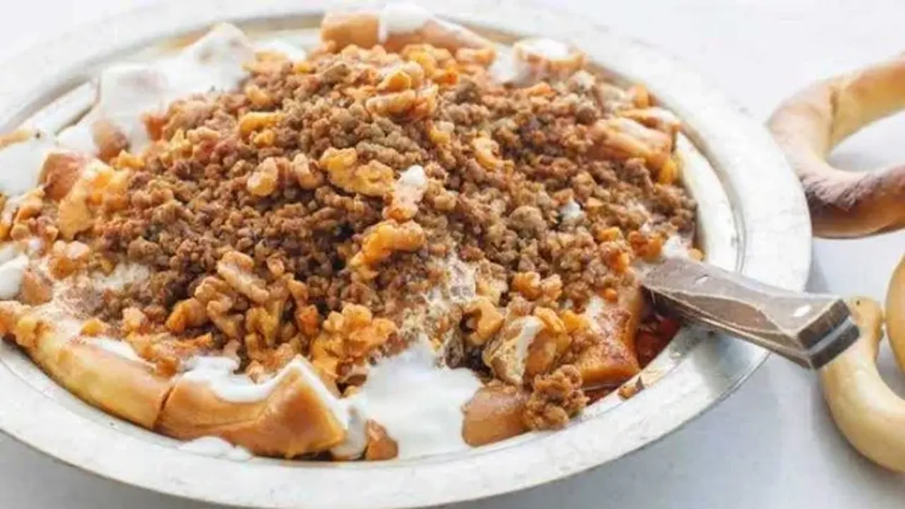 YAPILIŞI: Bayatlamış olan simitlerimizi önce enlemesine bıçak ile kesiyoruz. Daha sonra suyu güzel çekmesi için elimizle koparıyoruz. Ardından sıcak kemik suyu ile güzelce ıslatıyoruz. Fazla suyunu döküyoruz. Daha sonra sırasıyla sarımsaklı yoğurdu, baharatlarla kavrulmuş kıymayı ve tereyağını döküp bekletmeden servis yapıyoruz.