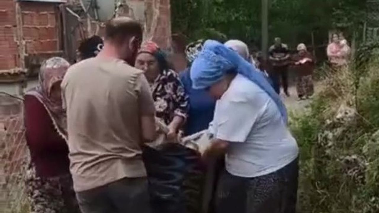 Gelini ve torunu ile yaşayan Huriye Nine, tedavisi için hastaneye götürülürken battaniye içinde taşındı. Yaklaşık 600 metrelik mesafedeki taşıma işinde Huriye Nine’ye komşuları da destek verdi.