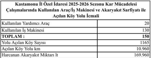 Bu süreçte, toplam 150 araçlık güçlü bir araç desteğiyle yürütülen çalışmalar neticesinde 1.165 köy yolunda yoğun ve aralıksız çalışma yapılmıştır. Açılan yolların toplam uzunluğu 10.960 kilometreye ulaşmış, sahada görev yapan ekiplerimiz tarafından bu çalışmalar sırasında yaklaşık 169 bin litre mazot kullanılmıştır.