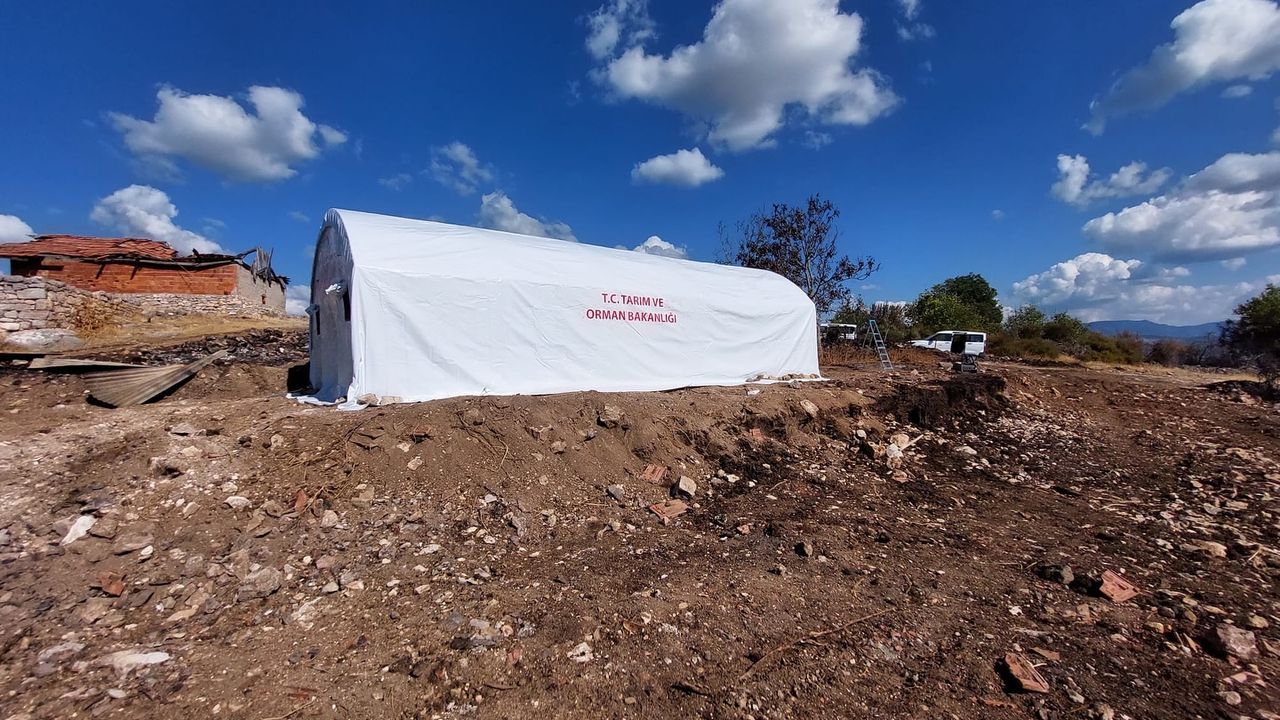 Yangının ardından harekete geçen İl ve İlçe Tarım ve Orman Müdürlüğü ekipleri, üreticinin yaralarını sarmak ve hayvanların barınma ihtiyacını karşılamak amacıyla bölgeye çadır ahır kurdu.