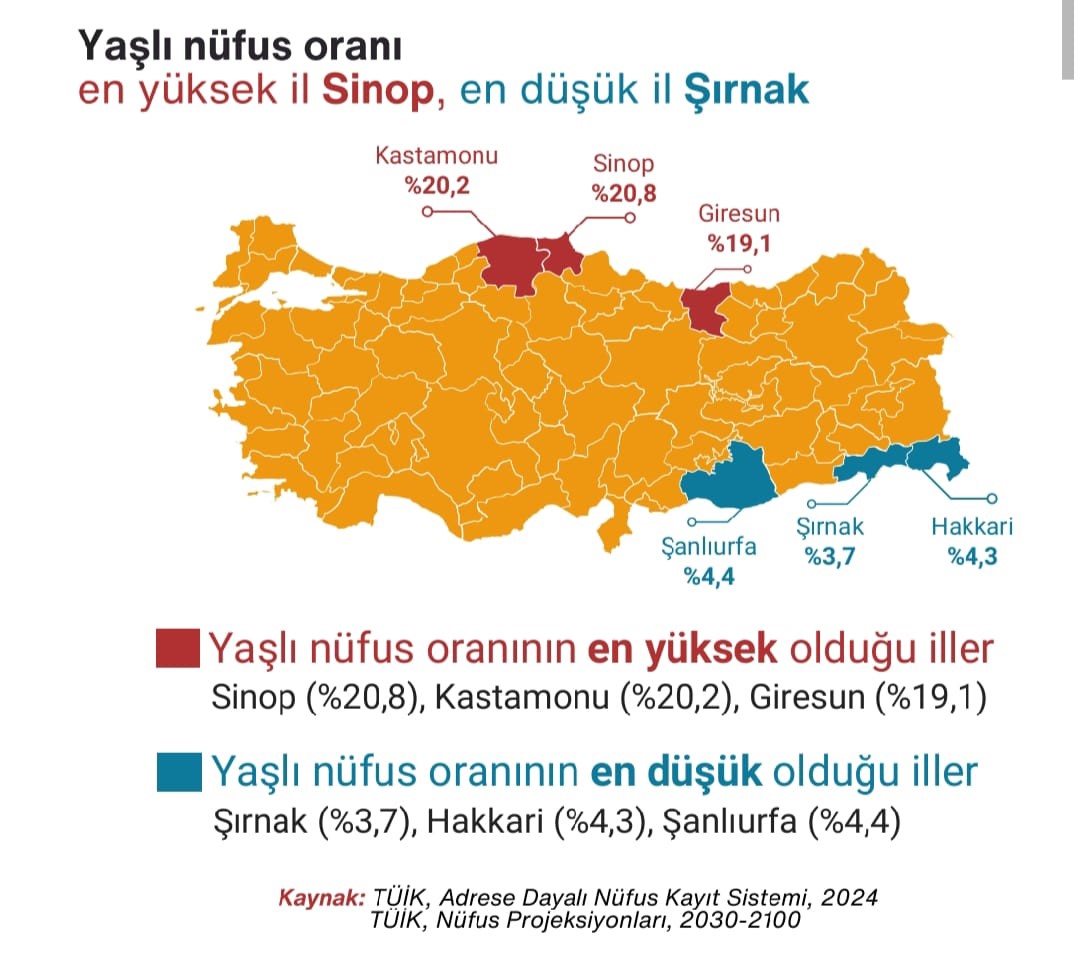 "Yaşlı nüfus oranı en yüksek il" Sinop (yüzde 20.8)...
