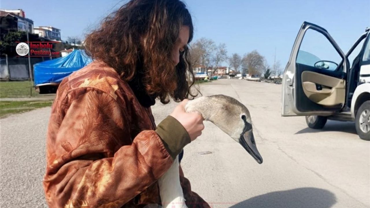 İnebolu ilçe esnaflarından Kaan Ormanlı ve oğlu Yiğit Ormanlı, Evrenye’de balık tuttukları sırada yaralı bir kuğu buldu.