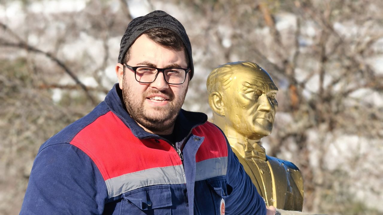 Başkomutan Gazi Mustafa Kemal Atatürk'ün büstü üzerinde biriken karları temizleyen silindir operatörü Sercan Gündüz, mesleki sorumluluğun yalnızca yol açmakla sınırlı olmadığını vurgulayarak şu ifadeleri kullandı: “İşimiz sadece yol açmak değil, vatanın her noktasında varız inşallah.”