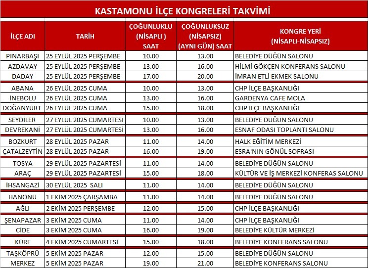 Parti tüzüğü ve ilgili yönetmelikler çerçevesinde yapılacağı belirtilen kongreler, 25 Eylül – 5 Ekim 2025 tarihleri arasında Kastamonu’nun tüm ilçelerinde gerçekleştirilecek.