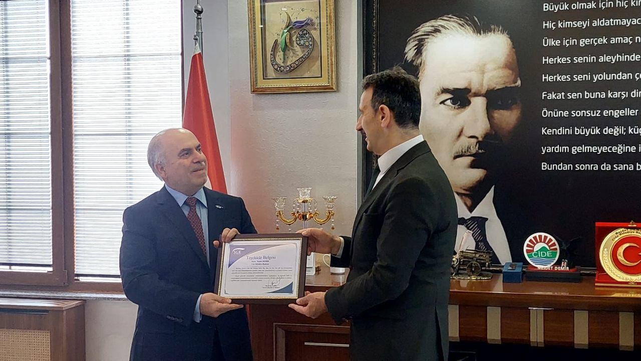 Öte yandan SGK İl Müdürü Emin Şahin, Müdür Yardımcısı Emre Türeyen ve Destek Hizmetleri Servisi Sorumlusu Yaşar Kocadağ, Cide Belediye Başkanı Nejdet Demir’i makamında ziyaret etti. Ziyarette, belediyenin borçsuz bir yapıya kavuşmasının önemine vurgu yapılırken, Başkan Demir’e teşekkür belgesi takdim edildi.