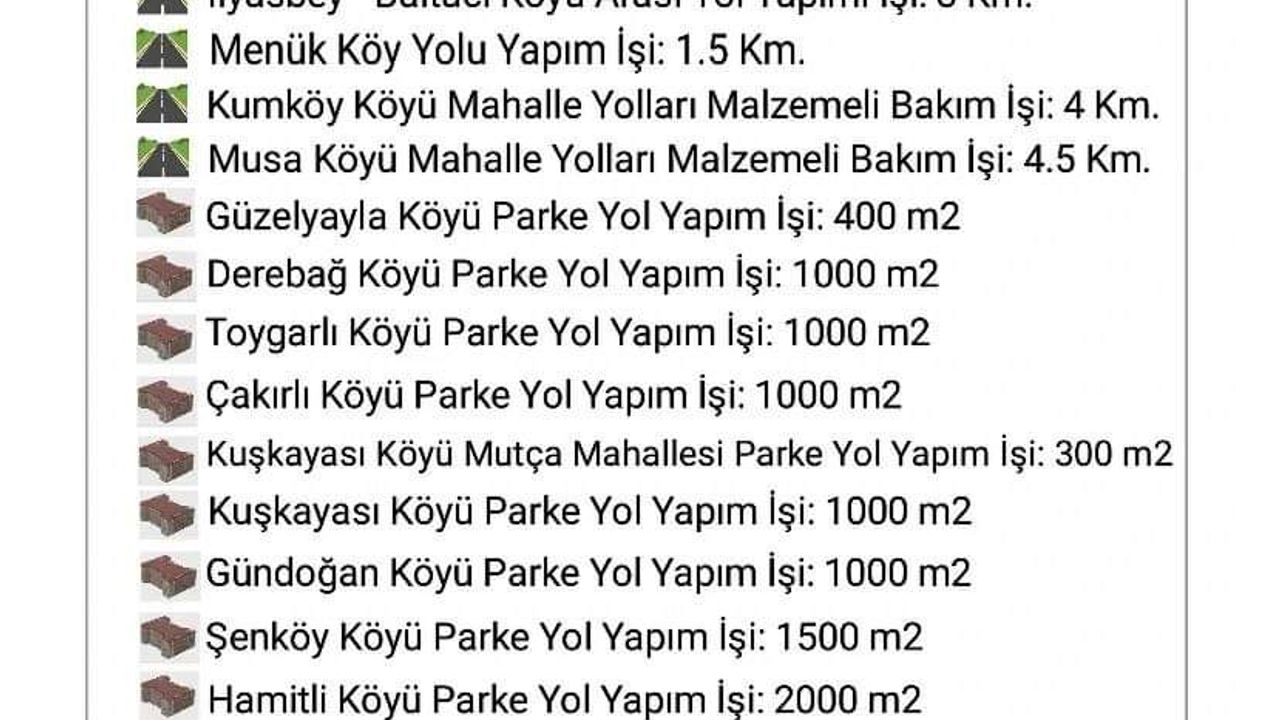Cide’de 17 köyümüze yapılacak yol yapım, bakım ve parke taşı döşeme çalışmalarını hazırladığı görsel ile sosyal medya hesaplarından paylaşan ilçe Kaymakamlığı, "Cide Kaymakamlığı Köylere Hizmet Götürme Birliği Başkanlığı ve Kastamonu İl Özel İdaresi tarafından 2023 yılında yapılan ve yapılması planlanan yol yapım ve bakım çalışmaları devam etmektedir" açıklamasında bulundu. (Mehmet SALMAN)