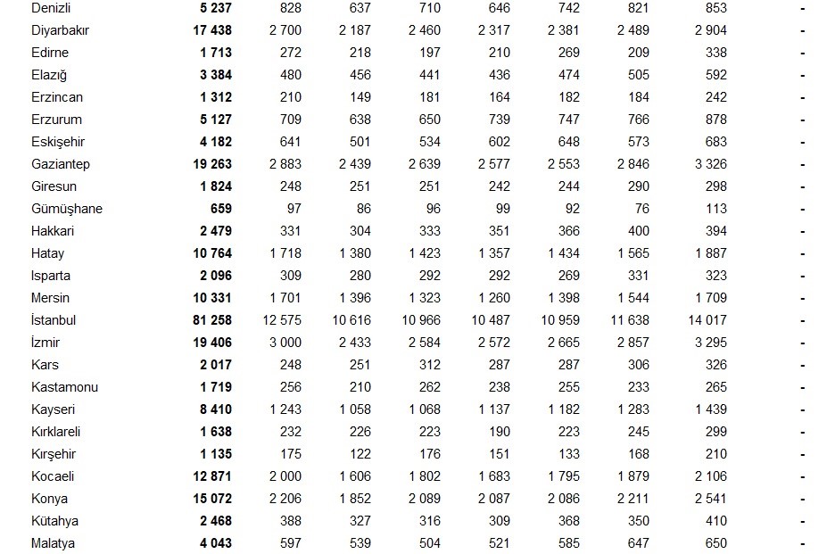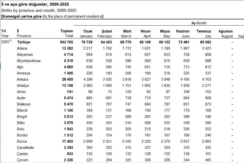 Türkiye genelinde “doğum sayısı” 2025 yılının ilk 7 ayında bir önceki yılın aynı dönemine göre “yüzde 8,3” azalarak “503 bin 765” olurken ölüm sayısı ise aynı dönemde “yüzde 0,7” artarak “294 bin 824” oldu.