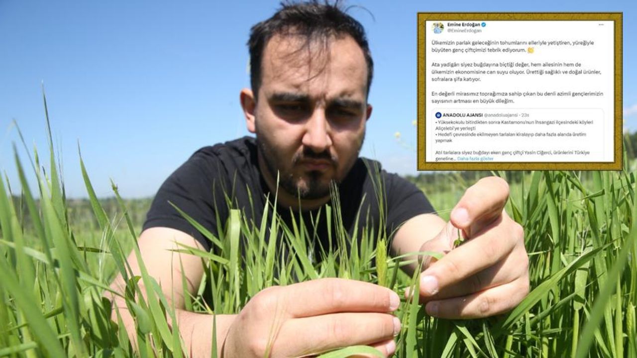 Yüksekokuldan mezun olduktan sonra memleketi İhsangazi’de atıl topraklara siyez ekerek üretim yapan Yasin Ciğerci’nin Anadolu Ajansı’nda yayınlanan haberini alıntılayan Emine Erdoğan, “Ülkemizin parlak geleceğinin tohumlarını elleriyle yetiştiren, yüreğiyle büyüten genç çiftçimizi tebrik ediyorum. Ata yadigârı siyez buğdayına biçtiği değer, hem ailesinin hem de ülkemizin ekonomisine can suyu oluyor. Ürettiği sağlıklı ve doğal ürünler, sofralara şifa katıyor. En değerli mirasımız toprağımıza sahip çıkan bu denli azimli gençlerimizin sayısının artması en büyük dileğim” ifadelerinde bulundu.