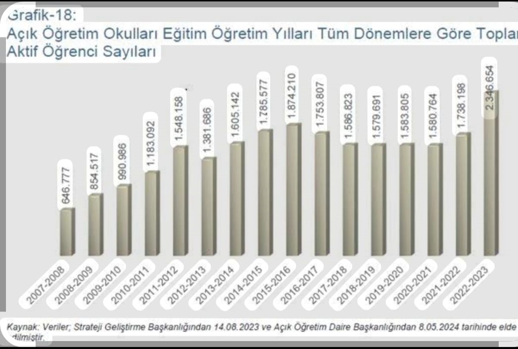 Tee 2022 yılında durumun ahvaline bakar mısınız, okulu bırakıp açıköğretime geçen öğrenci sayısı 2021'e göre üstüne koyarak 1 milyon 738 bin oldu o sene, her dört lise öğrencisinden birine tekabül ediyordu oran...