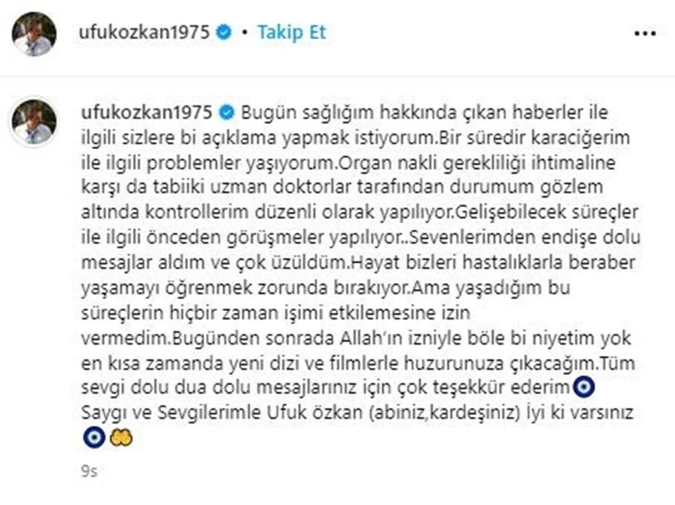 Ufuk Özkan yaptığı açıklamada şu ifadelere yer verdi; "Bugün sağlığım hakkında çıkan haberler ile ilgili sizlere bi açıklama yapmak istiyorum. Bir süredir karaciğerim ile ilgili problemler yaşıyorum. Organ nakli gerekliliği ihtimaline karşı da tabiiki uzman doktorlar tarafından durumum gözlem altında kontrollerim düzenli olarak yapılıyor. Gelişebilecek süreçler ile ilgili önceden görüşmeler yapılıyor. Sevenlerimden endişe dolu mesajlar aldım ve çok üzüldüm. Hayat bizleri hastalıklarla beraber yaşamayı öğrenmek zorunda bırakıyor. Ama yaşadığım bu süreçlerin hiçbir zaman işimi etkilemesine izin vermedim. Bugünden sonrada Allah’ın izniyle böye bi niyetim yok en kısa zamanda yeni dizi ve filmlerle huzurunuza çıkacağım. Tüm sevgi dolu dua dolu mesajlarınız için çok teşekkür ederim. Saygı ve Sevgilerimle Ufuk özkan (abiniz, kardeşiniz) İyi ki varsınız."