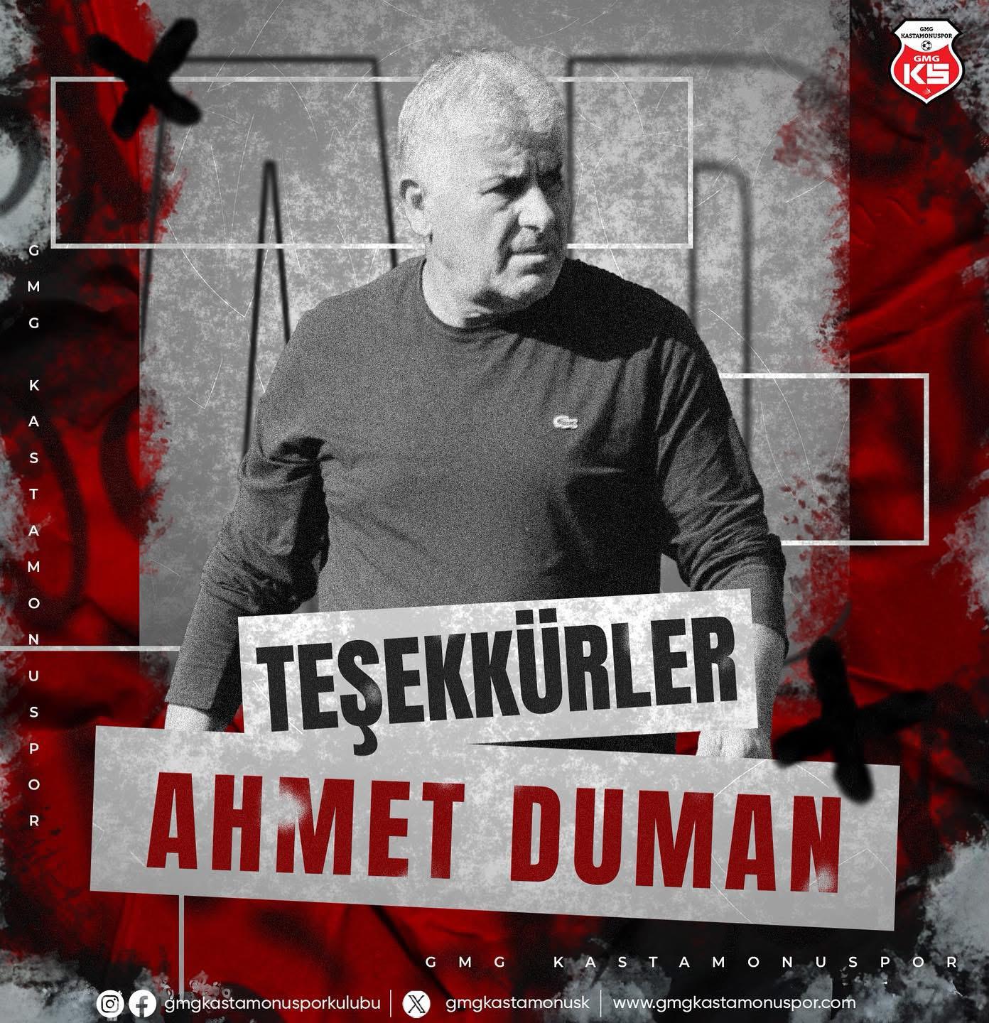 “Teknik Direktörümüz Ahmet Duman ile karşılıklı anlaşarak yollarımızı ayırmış bulunmaktayız. Kendisine kulübümüze verdiği emeklerden ötürü teşekkür ederiz" ifadeleri yer aldı.