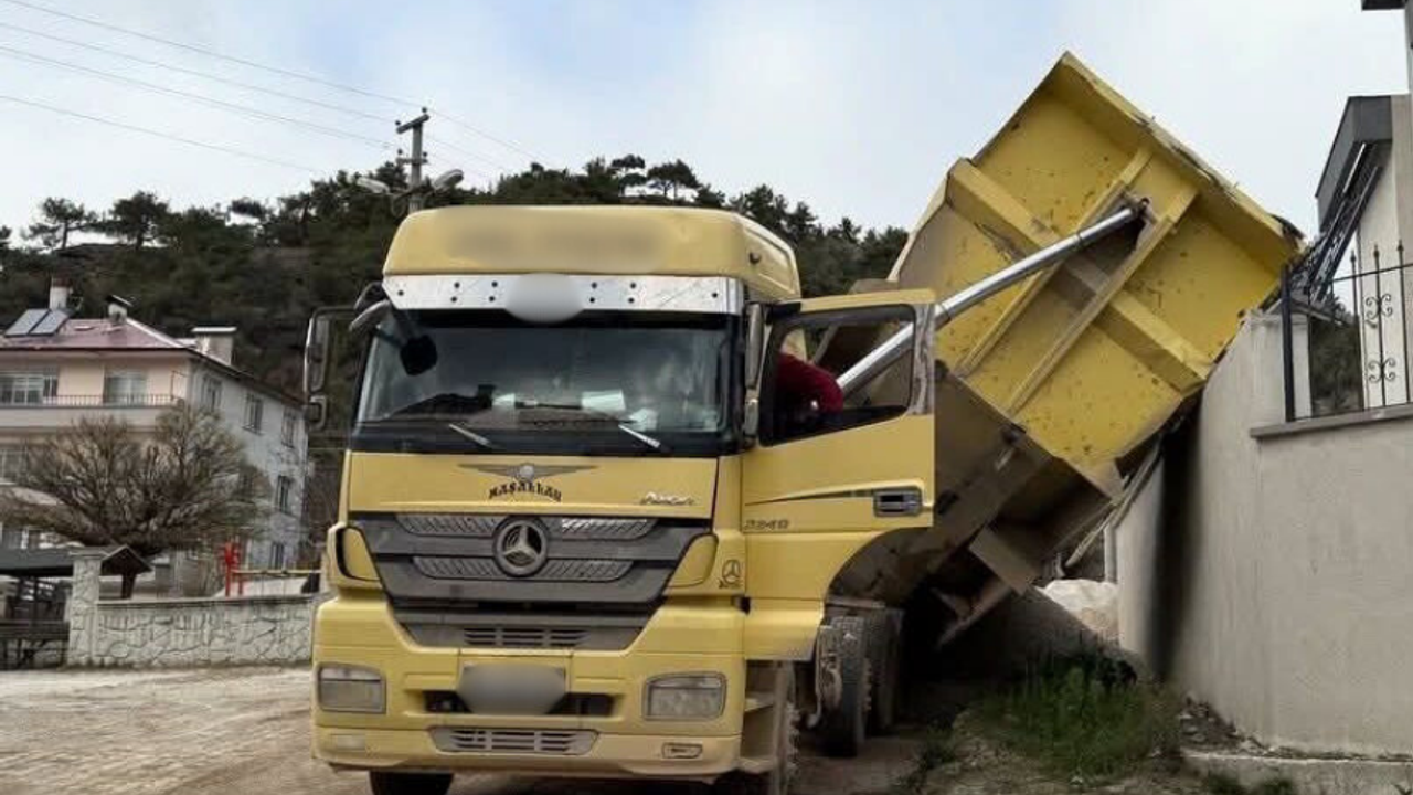 Edinilen bilgilere göre, hafriyat kamyonunun, kum boşaltımı sırasında kasası Hanönü Çok Programlı Lisesi bahçe duvarına devrildi.