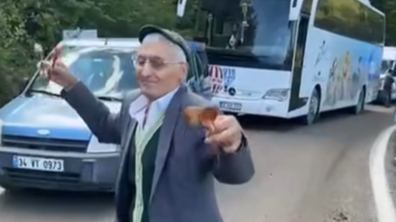 Trafiğin kilitlenmesi sırasında bir vatandaş oyun havası eşliğinde kaşıklarla oynadı. Yolun açılmasını bekleyen araç sürücüleri de keyifli anlar yaşadı.