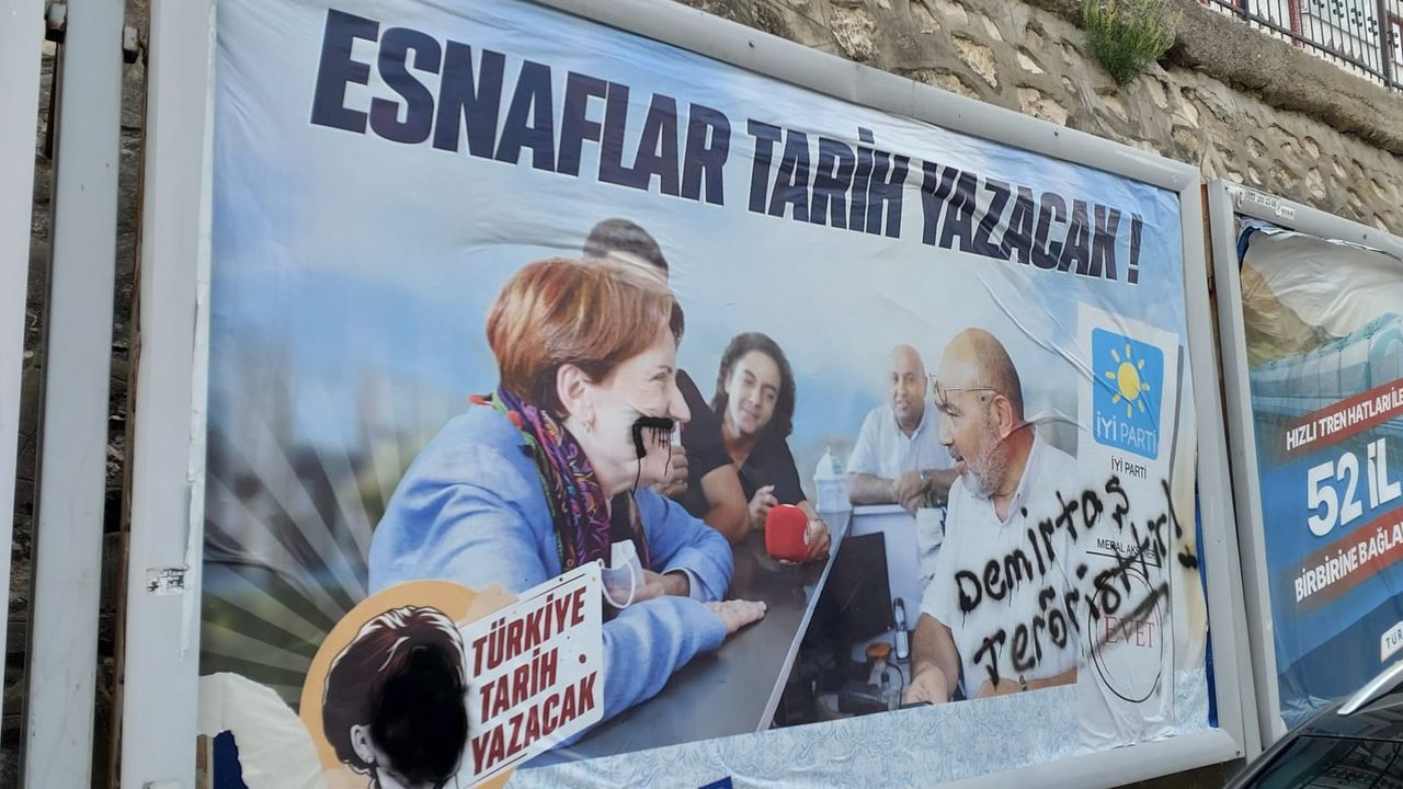 Afişlere sprey boya ile “Demirtaş teröristtir” yazılırken, Meral Akşener’in yüzü boya ile kapatıldı.