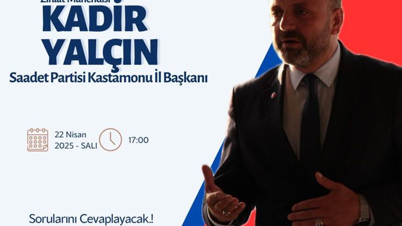 Saadet Partisi Kastamonu İl Başkanı Ziraat Mühendisi Kadir Yalçın, bugün saat 17.00’de moderatörlüğünü gazeteci Naime Akbin'in yaptığı programda TRend MEDYA’nın canlı yayın konuğu olacak.
