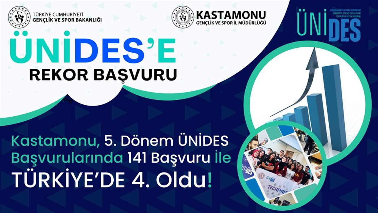 Gençlik ve Spor Bakanlığı Gençlik Hizmetleri Genel Müdürlüğü tarafından yürütülen Üniversite Öğrenci Toplulukları İş Birliği ve Destek Programı (ÜNİDES) 5. Dönem başvuruları tamamlandı. Üniversite öğrencilerinin sosyal sorumluluk ve gönüllülük alanındaki projelerine destek sağlayan programa, Kastamonu’dan 141 proje başvurusu yapıldı. Bu sonuçla Kastamonu, Türkiye genelinde en fazla başvuru yapılan 4. il oldu.
