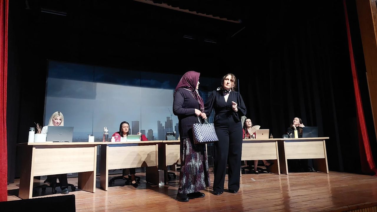 Yönetmenliğini Hatice Ertuğrul’un üstlendiği oyunun senaryosunu Gül Banu Çiçek Bideci üstlendiği tamamı kadınlardan oluşan toplumsal ve bireysel ilişkileri ele alan oyunun oyuncu kadrosunda, Yeliz Erdoğan, Zerrin Sayan, Hicret Serra Çetin, Hatice Ertuğrul, Rümeysa Yazıcı, Zeynep Parmaksızoğlu ve senarist Gül Banu Çiçek Bideci yer aldı. Sahne arkasında ise Rabia Yıldırım sufleur (suflör) olarak, Nagihan Şalkam ise ışık ve ses sorumlusu olarak görev aldı. Yaklaşık 45 dakika süren “Bir Çay Molası” tiyatro gösterimi kadrosu ve hazırlığı ve sahnelenmesi dikkat çekti. Tiyatro izlemeye gelenler keyifli ve düşündürücü anlar yaşadı.