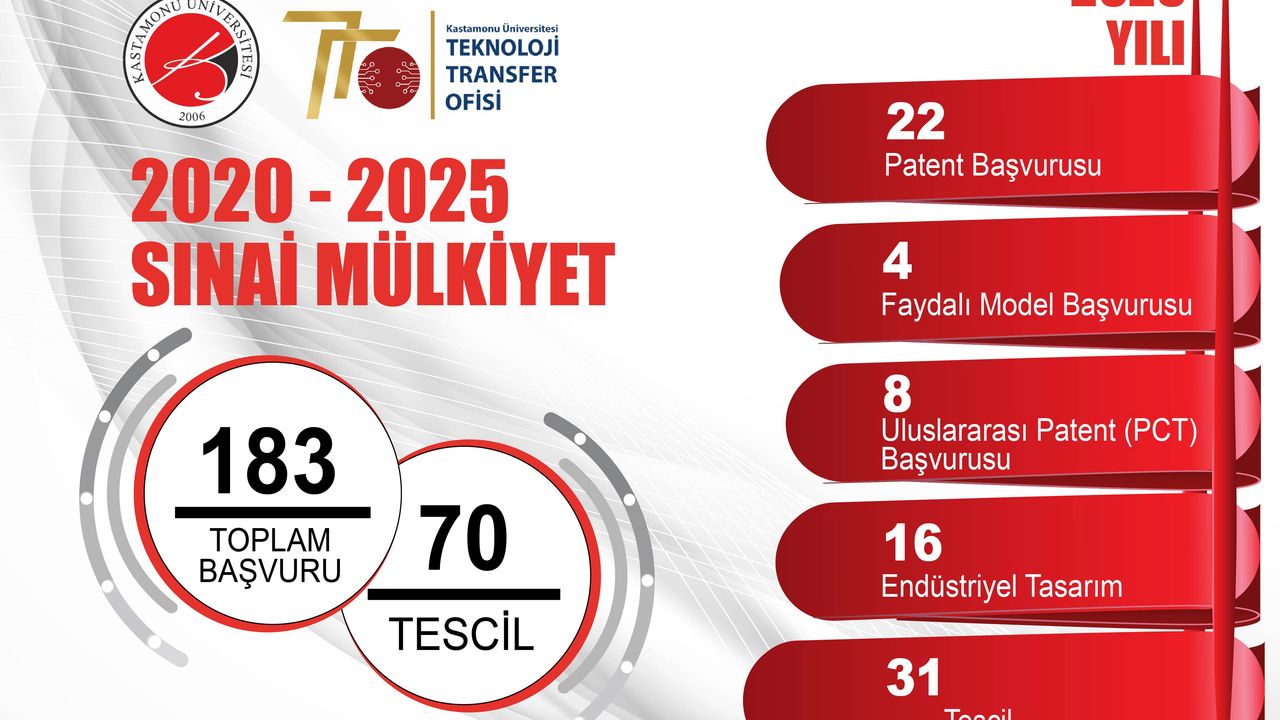 2025 yılı özelinde ise Kastamonu Üniversitesi tarafından 22 patent, 4 faydalı model, 8 uluslararası (PCT) patent ve 16 endüstriyel tasarım başvurusu yapıldı. Aynı yıl içerisinde 13 patent/faydalı model ile 18 endüstriyel tasarım, Türk Patent ve Marka Kurumu tarafından tescil edilerek koruma altına alındı.