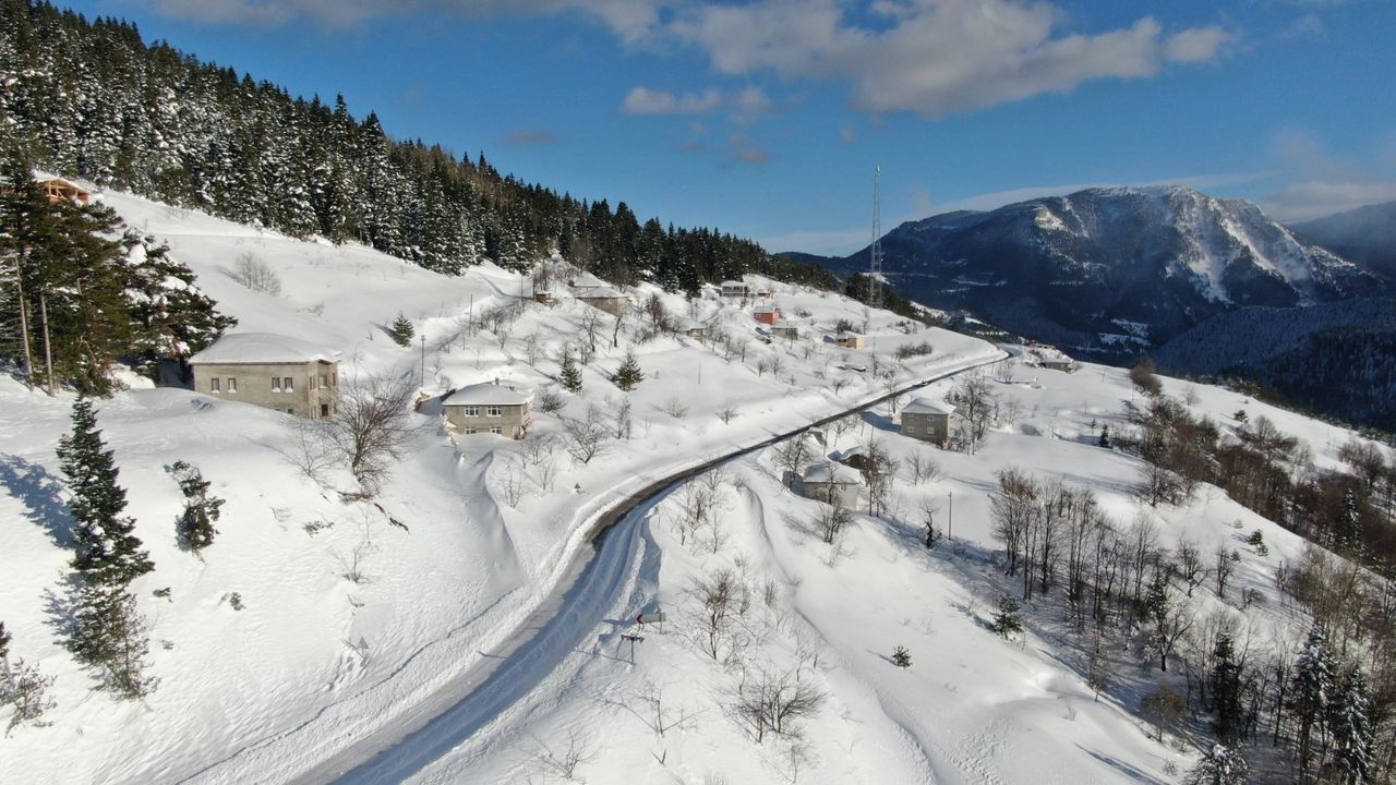Kış mevsimiyle birlikte masalsı bir atmosfere kavuşan Yaralıgöz Dağı’nda ahşap yapılar kar örtüsü altında kaldı. Doğaseverler ve fotoğraf tutkunları için açık hava stüdyosunu andıran bölge, dronla havadan görüntülendi.