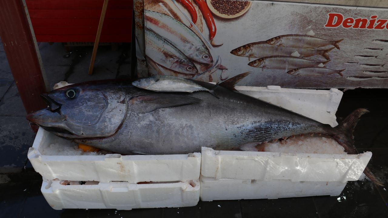 Ege açıklarında yakalanan 1 metre uzunluğunda 50 kilogram ağırlığındaki orkinosu, Cebrail Mahallesi Şehit Yavuz Ulutaş Çelikoğlu Sokak'ta bulunan bir balıkçı satın alarak tezgahına koydu.