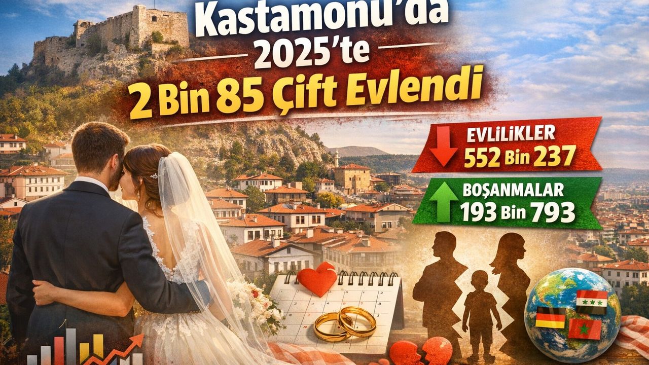 Kastamonu’da evlenen çiftlerin sayısı 2024 yılında 2 bin 99 iken 2025 yılında 2 bin 85 oldu. Bin nüfus başına düşen evlenme sayısını ifade eden kaba evlenme hızı 2025 yılında binde 5,47 olarak gerçekleşti. Kastamonu’da ortalama ilk evlenme yaşı, 2025 yılında erkekler için 27,6 kadınlar için ise 25,7 oldu. Erkek ile kadın arasındaki ortalama ilk evlenme yaş farkı ise 1,9 yaş olarak gerçekleşti.