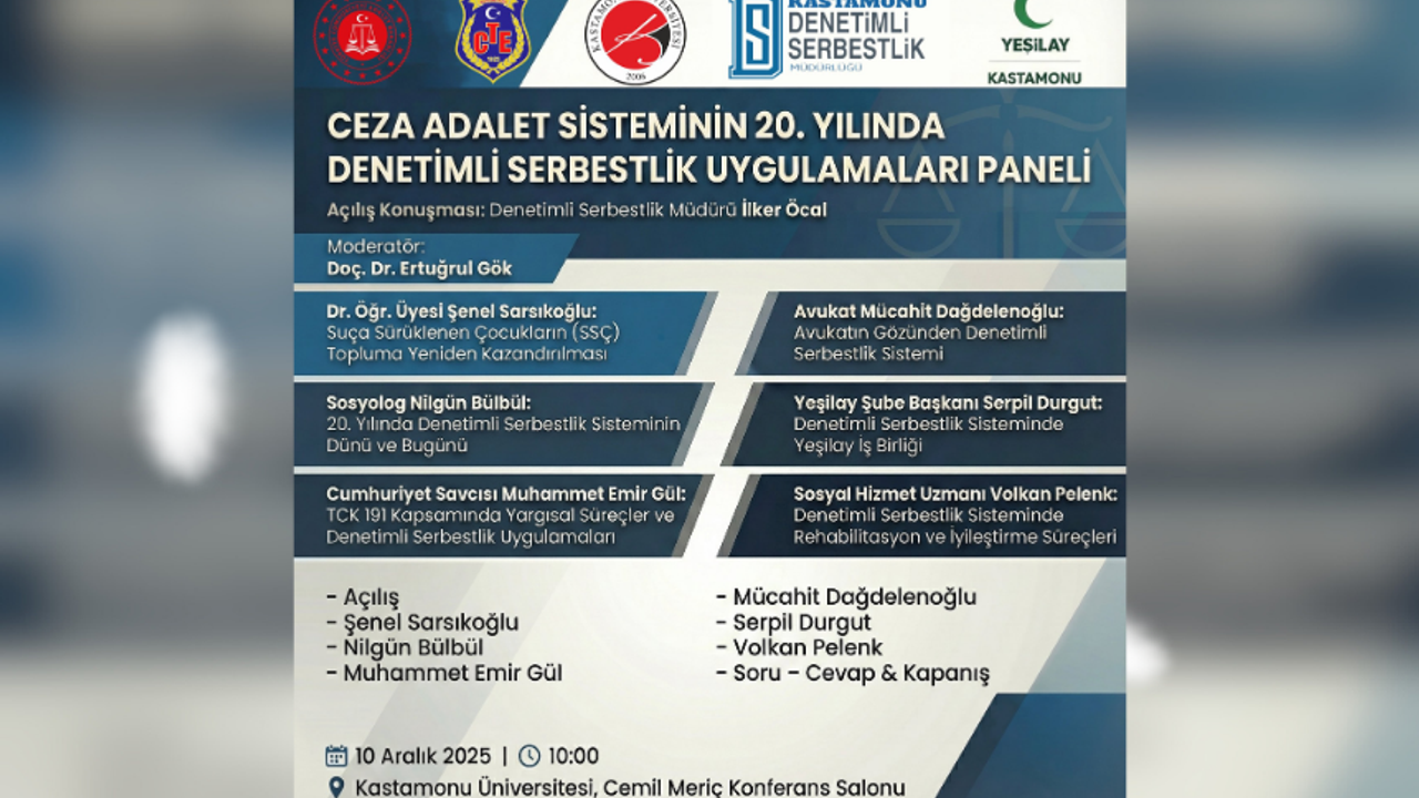 Kastamonu Denetimli Serbestlik Müdürlüğü, denetimli serbestlik uygulamalarının 20. yılı kapsamında kapsamlı bir panel düzenleyecek. “Ceza Adalet Sisteminin 20. Yılında Denetimli Serbestlik Uygulamaları” başlıklı program, 10 Aralık 2025 Çarşamba günü saat 10.00'da Kastamonu Üniversitesi Cemil Meriç Konferans Salonu’nda gerçekleştirilecek.