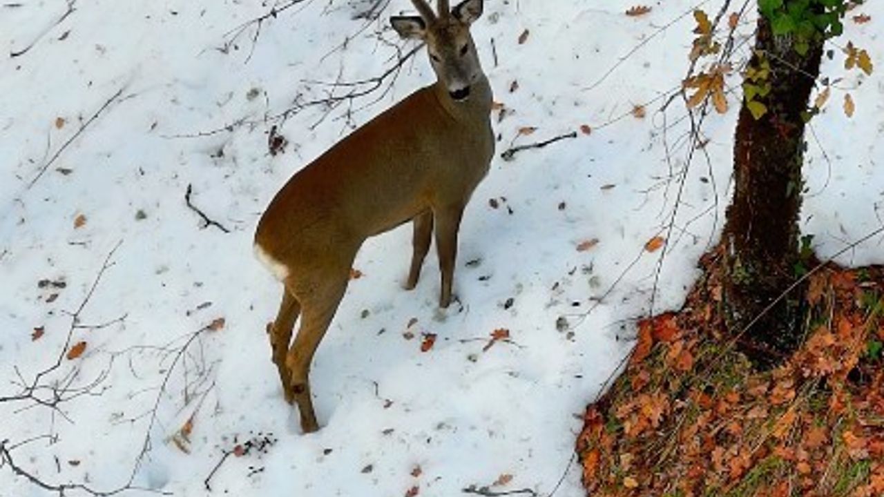 Doğadaki kış manzarasını görüntülemek için dron uçuran Kubilay Onurcan Çalık, çekimler sırasında sessizce ilerleyen iki karacayı fark etti. Karla kaplı arazide çevreyi kontrol ederek ilerleyen karacaların, zaman zaman durup besin aradığı ve bulduklarını tükettiği anlar dron görüntülerine yansıdı.