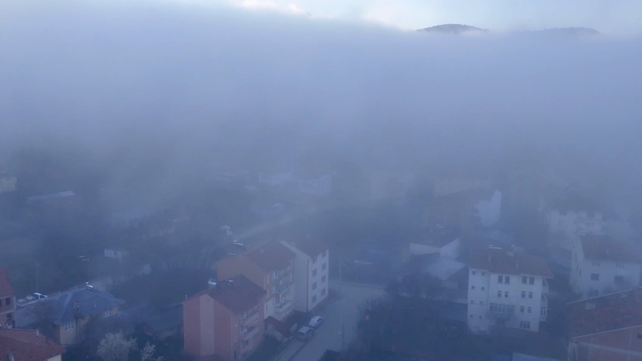 İlçe merkezini tamamen örten yoğun sis tabakası havadan görüntülendi.