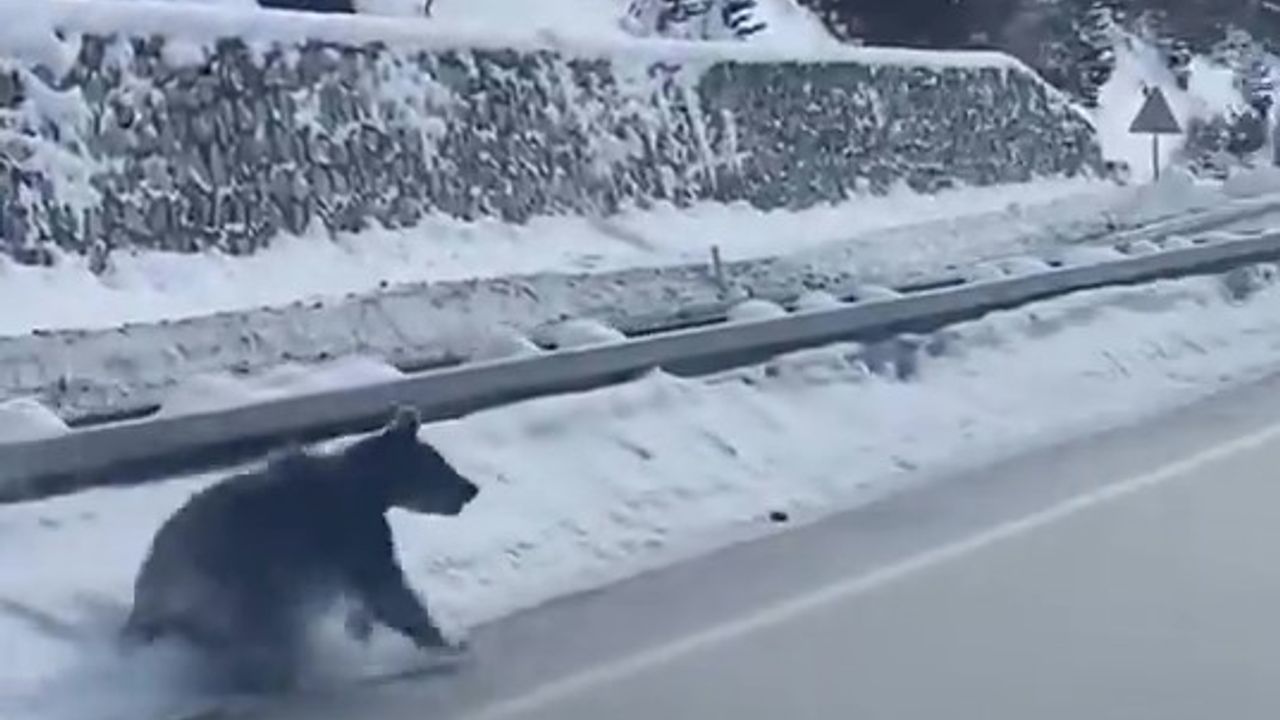 Soğuk hava koşullarına rağmen yiyecek arayışında olduğu değerlendirilen ayılar, bir süre yol kenarında dolaştıktan sonra yeniden ormanlık alana yöneldi.