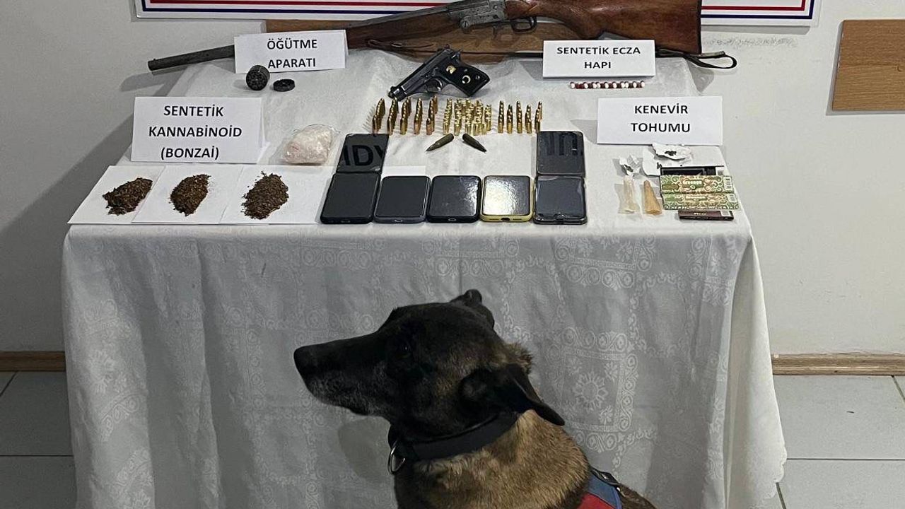 Edinilen bilgiye göre, 8 şüpheliye yönelik 9 farklı adreste yapılan aramalarda; 57 gram sentetik kannabinoid katkılı tütün, 18 adet sentetik ecza hapı, 3 gram kenevir tohumu, 1 adet uyuşturucu madde öğütme aparatı, 19 adet kilitli poşet, 1 adet ruhsatsız tabanca, 70 adet tabanca fişeği, 1 adet ruhsatsız av tüfeği, 7 adet cep telefonu ve 7 adet SIM kart ele geçirildi.