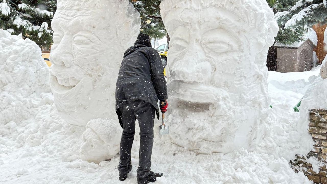 İlçe merkezinde yaptığı çalışmalarda insan yüzü figürlerini kar kütlelerine işleyen Kömür, detaylarıyla adeta taş heykelleri aratmayan eserler oluşturdu.