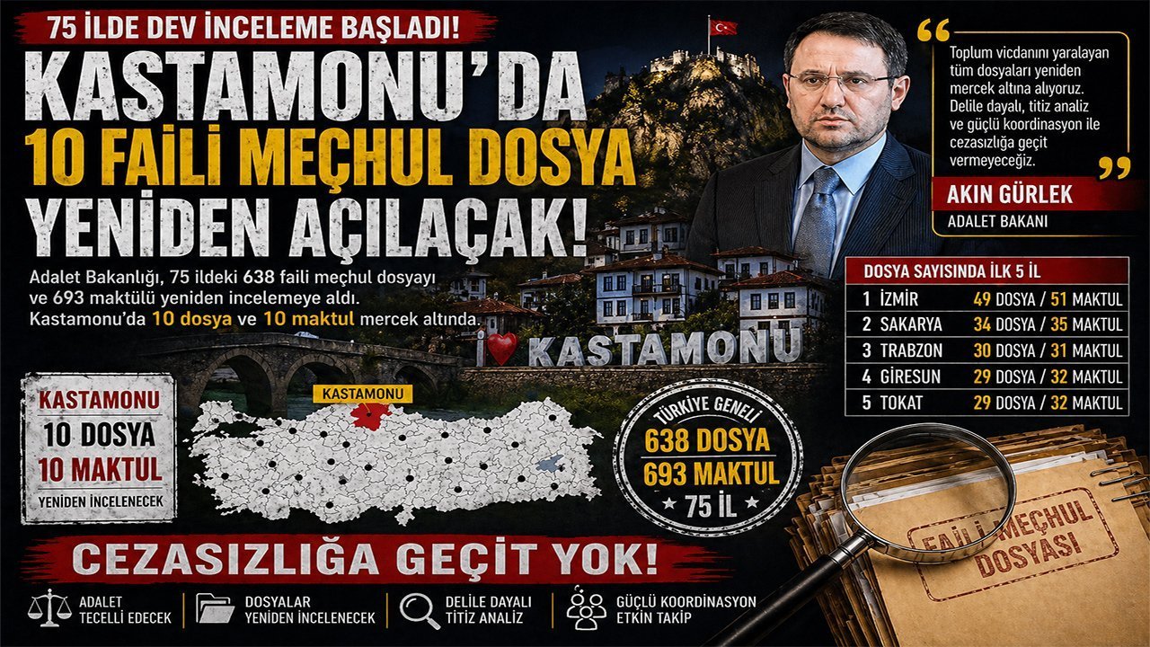 Hazırlanan sıralamaya göre Türkiye genelinde 638 soruşturma dosyası ve 693 maktul için yeniden inceleme süreci başlatılırken, Kastamonu listede 10 dosya ve 10 maktul ile yer aldı.