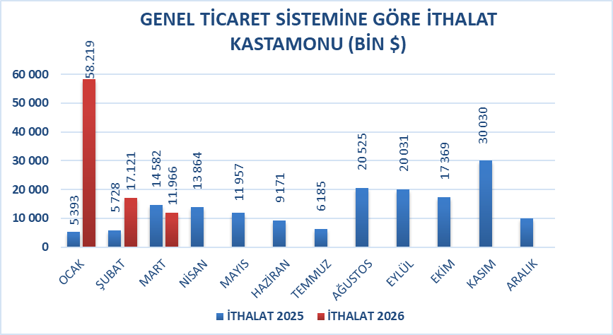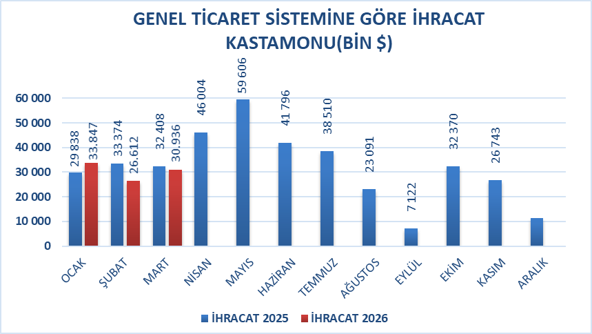 Genel ticaret sistemi kapsamında üretilen geçici dış ticaret verilerine göre, 2026 yılı Mart ayında Kastamonu’dan yapılan ihracat 30 milyon 936 bin dolar, ithalat ise 11 milyon 966 bin dolar olarak kaydedildi. Bu dönemde ihracatın ithalatı karşılama oranı yüzde 258,5 olarak açıklandı.