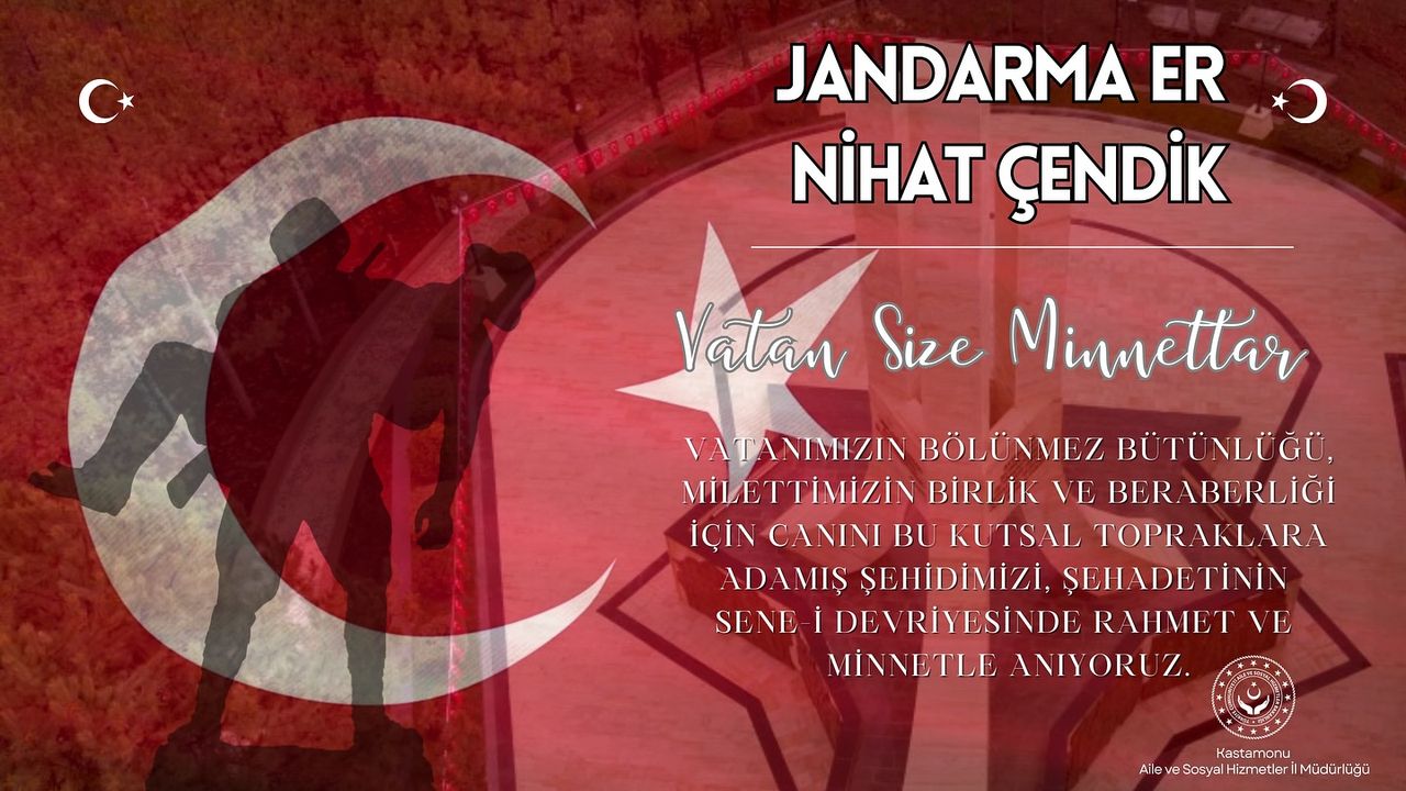 Yapılan açıklamada, "Kastamonu ili Devrekani ilçesi şehidimiz Jandarma Er Nihat Çendik, 23.05.1993 tarihinde şehit olmuştur. Şehadetinin sene-i devriyesinde şehidimiz Nihat Çendik’e ve aziz vatanımız uğruna şehadete eren tüm şehitlerimizi rahmet, minnet ve şükranla anıyoruz. Ruhları şad olsun" ifadelerine yer verildi.