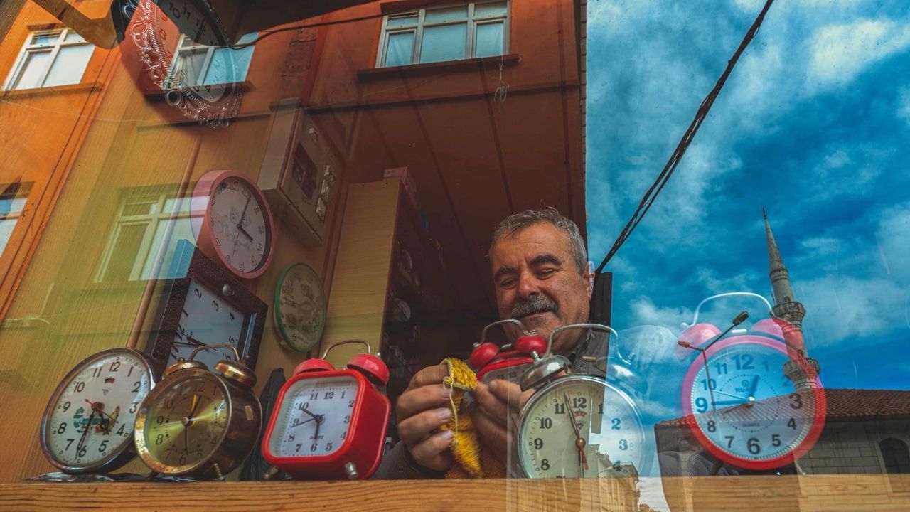 Karahan’ın atölyesinde bir cam vitrin, içi eski çalar saatlerle dolu ve bir şehrin tarihine tanıklık ediyor.