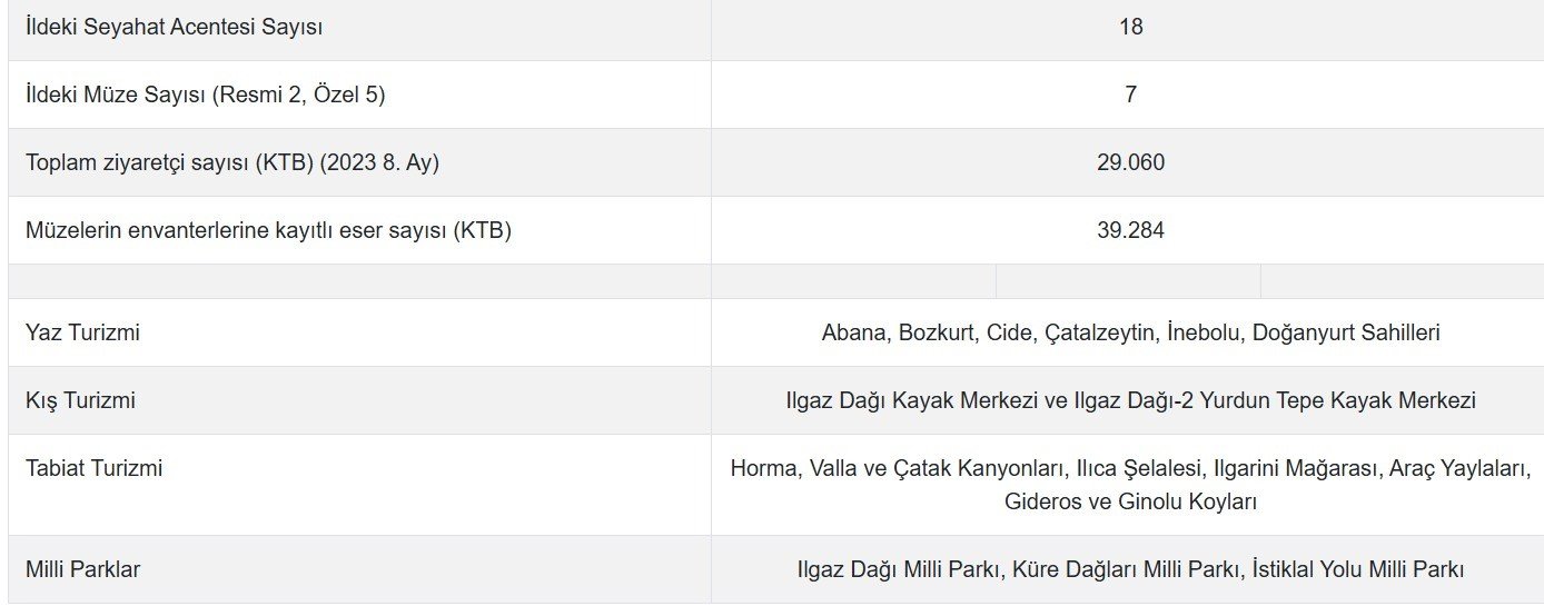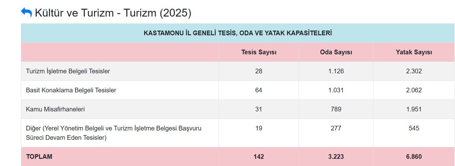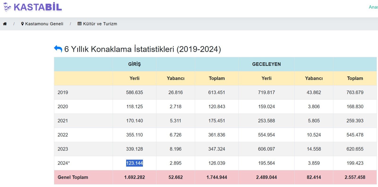 Kastamonu’nun valilikçe kaydı verilen son turizm istatistiği 2024 yılına ait, Kastamonu’ya 2024 yılında giriş yapan yerli turist sayısı “123 bin 144”, yabancı turist sayısı “2 bin 895”.
