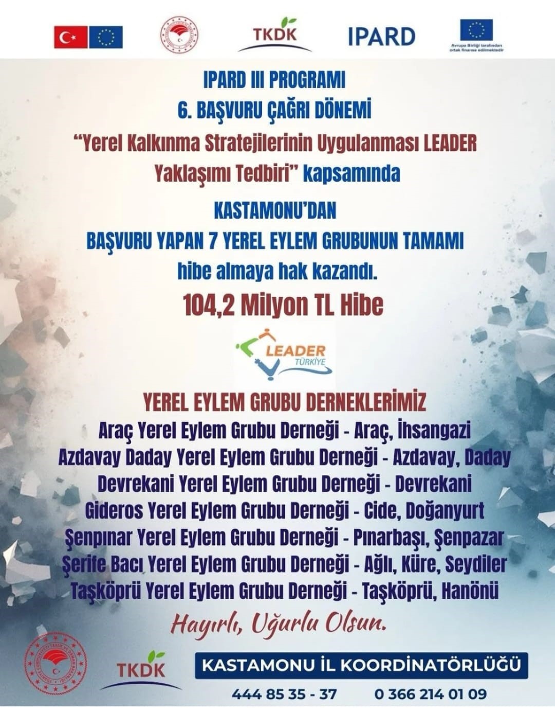 IPARD III Programı 6. Başvuru Çağrı Dönemi kapsamındaki LEADER Yaklaşımı Tedbiri üzerinden ülkemizdeki farklı yörelerde olduğu üzere Kastamonu’dan başvuran 7 yerel eylem grubu da destek hakkı kazandı.