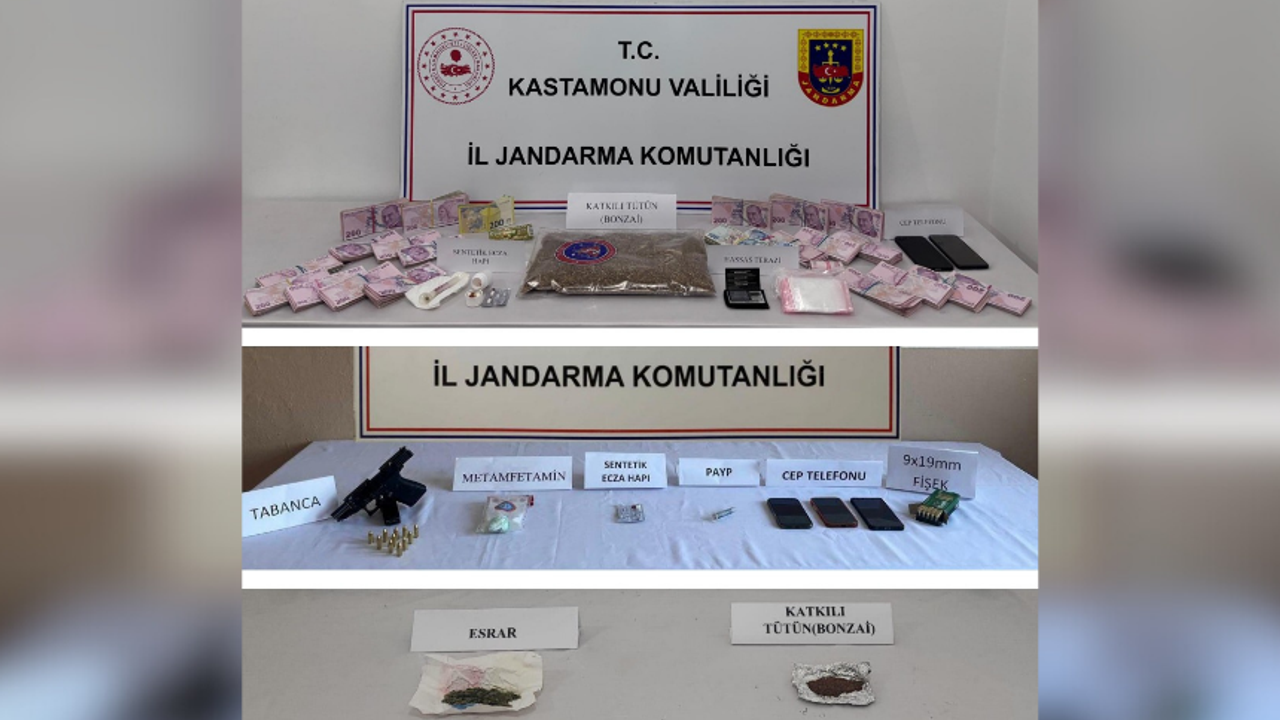 19 gram metamfetamin, 527 gram bonzai, yaklaşık 90 kullanımlık 2 adet bonzai emdirilmiş peçete parçası, 6 gram esrar, 3 adet ekstazi hap, 4 adet sentetik ecza hapı, 194 adet mini kilit poşet, 1 adet hassas terazi, 2 adet uyuşturucu kullanma aparatı, 1 adet ruhsatsız tabanca ve 29 adet tabanca fişeği, 5 adet cep telefonu ve SIM kartı, uyuşturucu ticaretinden elde edildiği düşünülen 200 dolar ile 1.180 avro ve 236.900 TL nakit para ele geçirildi.