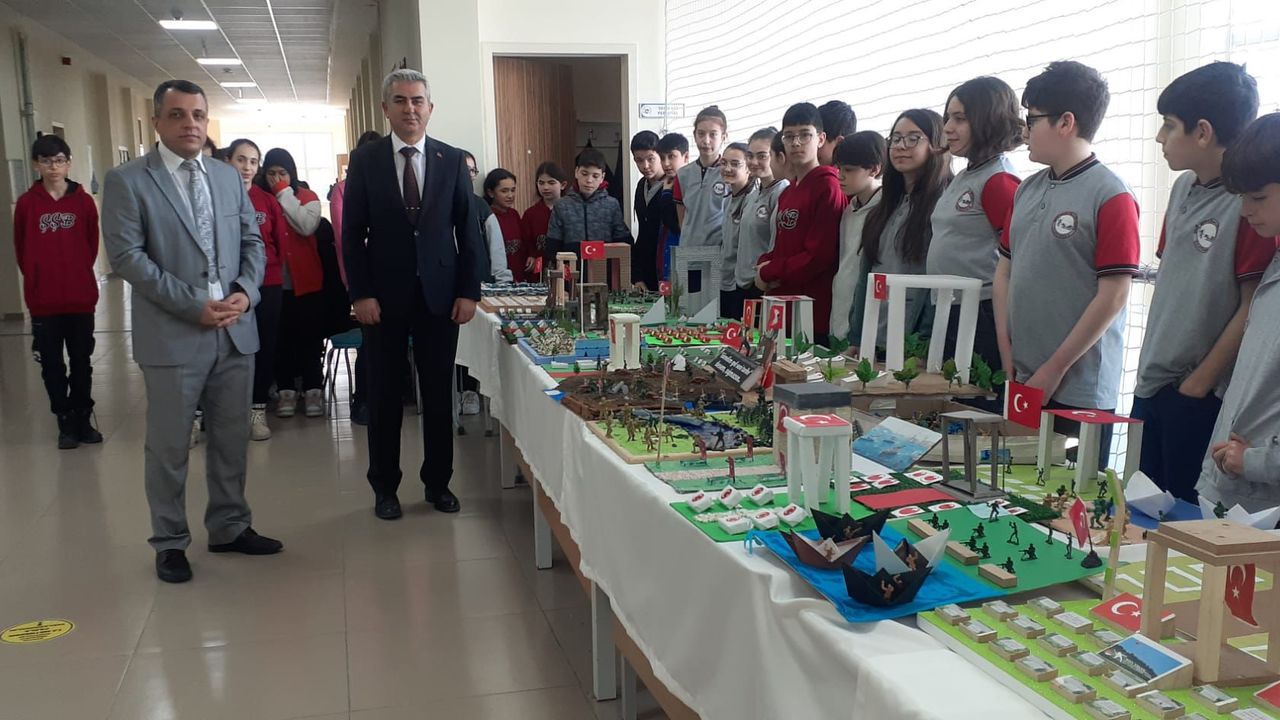 Daha sonra okul müdürü Halit Özden’le Prof. Dr. Selahattin Kaymakçı, okul öğrencilerinin zihinlerinden süzülerek ellerinde becerileriyle somutlaşıp anlam bulan “Maketlerin Dilinden Çanakkale” adlı serginin açılışını yaptılar.