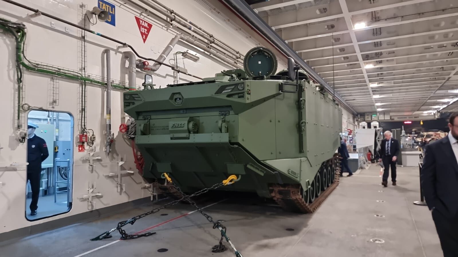 Devasa yapısıyla Southampton kıyısının birçok noktasından görülebilen TCG Anadolu gemisinde düzenlenen etkinlikte Türk savunma sanayisinin önemli ürünleri tanıtıldı. Gemide sergilenen ürünler arasında yerli SİHA’lar, zırhlı araçlar ve çeşitli askeri teknoloji sistemleri dikkat çekti. Özellikle Bayraktar TB3 ve Bayraktar TB2 SİHA’ları davetlilerin büyük ilgisini gördü.