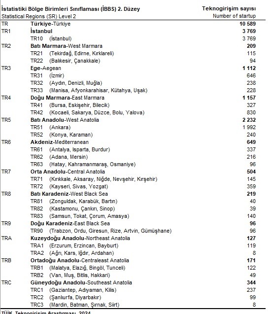 (Teknogirişim” alanında illerin görünümünü “İstatistiki Bölge Birimleri Sınıflaması 2. Düzey’e Göre Teknogirişim Sayısı” tablosunda gösterdi 2024 yılı araştırmasında TÜİK…