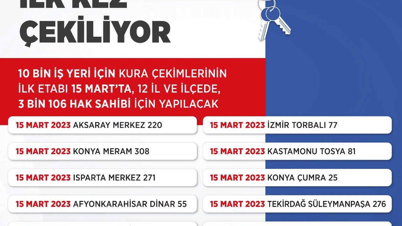 “İlk İş Yerim” projesi kapsamında, 10 bin iş yeri için 15 Mart'ta başlanacak kuralarla 12 ilde, 3 bin 106 iş yerinin hak sahipleri belirlenecek. İlk etabı Aksaray'da başlayacak çekilişlerin il ve ilçelere göre dağılımı şöyle: