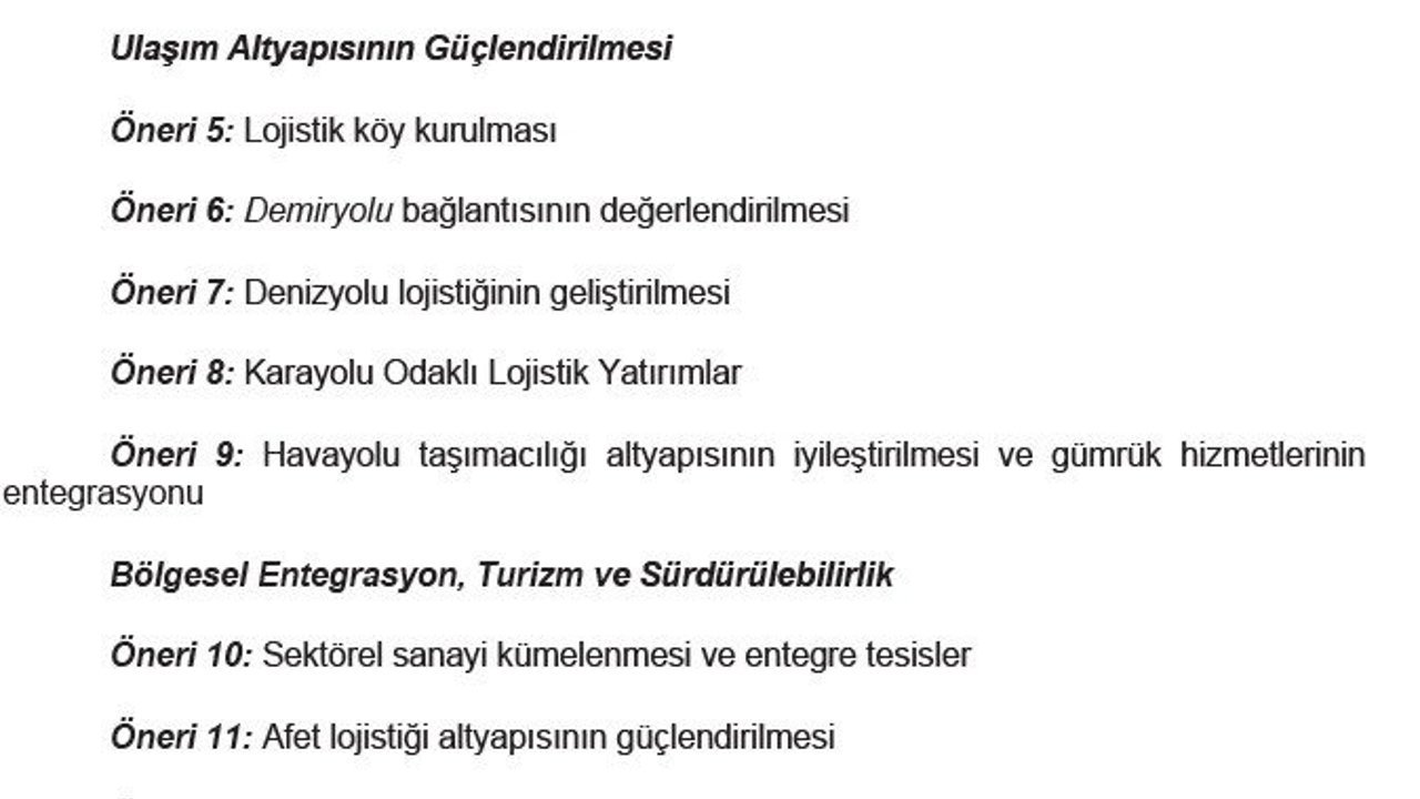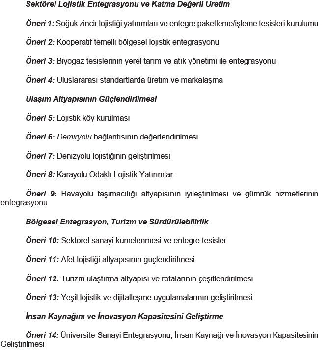 “Bu raporun ortaya koyduğu analizler, Kastamonu’nun lojistik sisteminde öncelikli olarak altyapı yatırımları, demiryolu bağlantısının hayata geçirilmesi, karayolu bakımının güçlendirilmesi, İnebolu Limanı’nın modernizasyonu, havalimanında kargo terminali kurulması gibi ihtiyaçları ön plana çıkarmıştır. Bununla birlikte organize sanayi bölgeleri ve tarımsal üretim merkezlerine entegre lojistik köylerin kurulması gündeme alınabilir. Soğuk zincir tesisleri, orman ürünleri için özel depolama alanları, turizm lojistiği için altyapı desteği gibi sektörel lojistik çözümleri ele alınmalıdır. Özellikle sel, heyelan ve deprem gibi afetlere karşı alternatif güzergâh planları, acil durum depolama alanları ve insani yardım lojistiği kapasitelerinin güçlendirilmesi noktasında afet lojistiğine yönelik atılan ve atılacak adımlar önem arz etmektedir. Kalifiye insan kaynağı yetiştirme noktasında fakülteler, meslek yüksekokulları ve sektör iş birliğiyle lojistik insan kaynağının geliştirilmesine yönelik faaliyetlerin sayısı artırılabilir. Sonuç olarak Kastamonu doğru yatırımlar ve stratejik yönelimlerle Batı Karadeniz’in önemli lojistik merkezlerinden biri olabilecek potansiyele sahiptir. Ancak bu dönüşümün gerçekleşebilmesi için kamu, özel sektör, üniversite ve sivil toplum aktörlerinin iş birliği önem taşımaktadır.”)