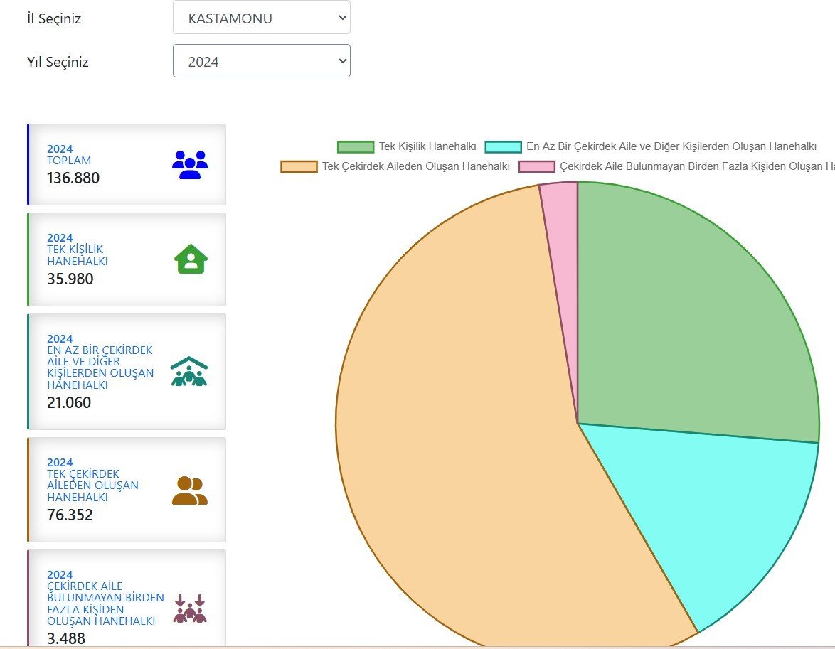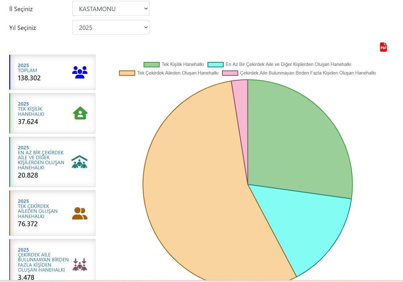 (2024 yılı itibarıyla Kastamonu'daki toplam 136 bin 880 hanenin 35 bin TL 980'i yalnız yaşayan bireylere ev sahipliği yapıyordu, aradan bir yıl geçti, Kastamonu’da hane sayısı 138 bin 302’ye yükselirken tek kişilik hane sayısı da 37 bin 624’u çıktı…