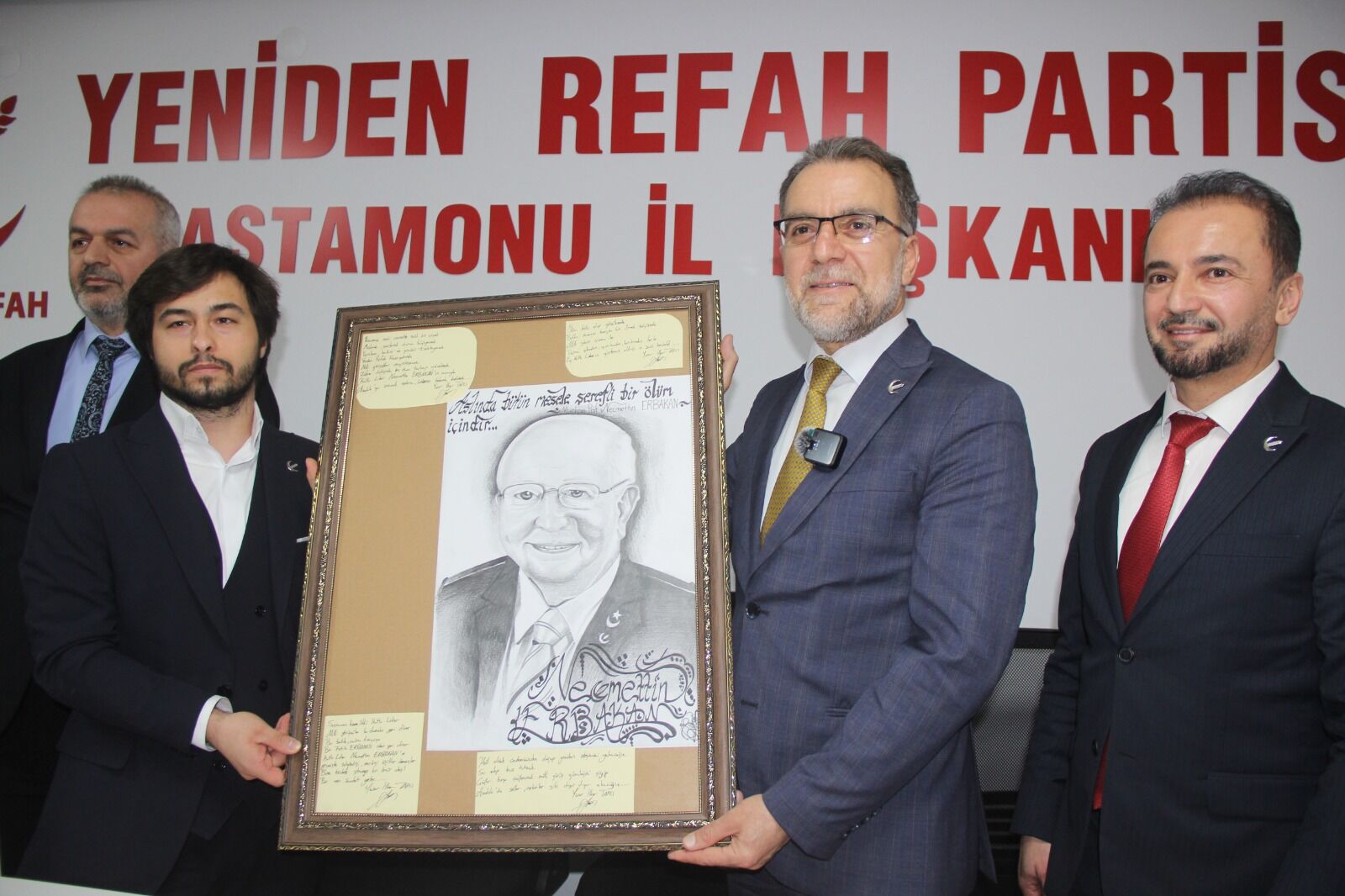 Yeniden Refah Partisi Genel Başkan Yardımcısı Nureddin Gül’e günün anısına Başkan Akif Güzel hediye verdi. Kastamonu Üniversitesi Güzel Sanatlar Öğrencisi İlker Topçi’de kendisinin hazırladığı Necmettin Erbakan’ın resmi ve bazı cümlelerinin yer aldığı tabloyu Nureddin Gül’e hediye etti.